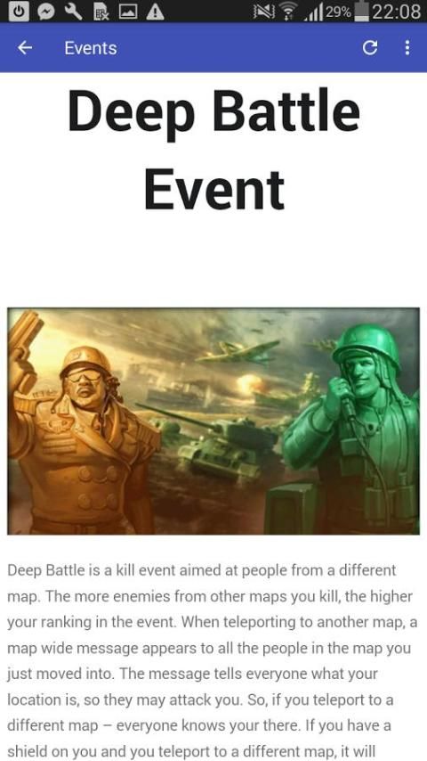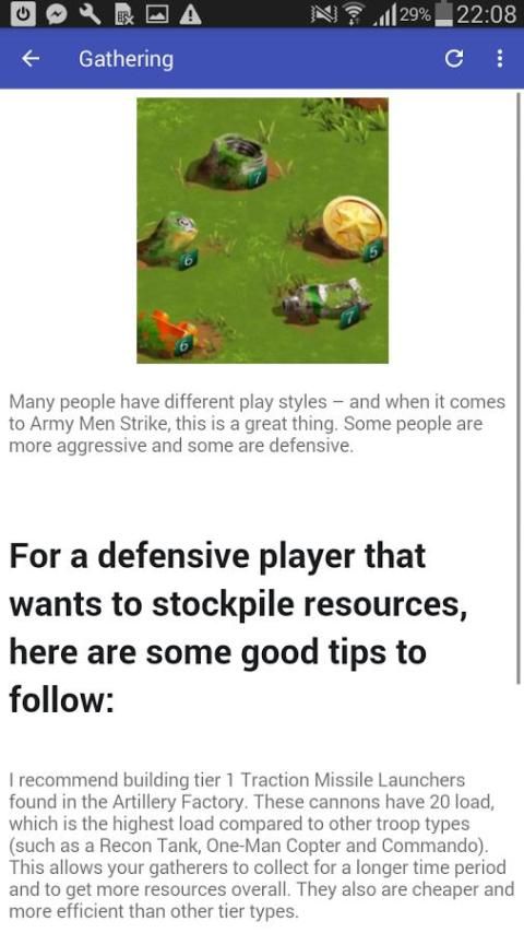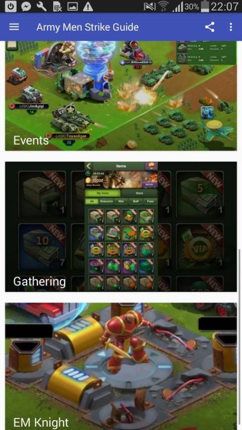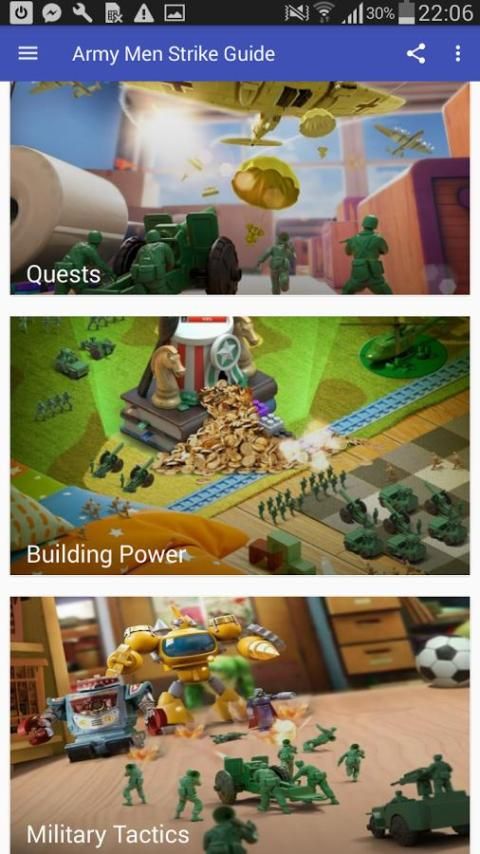 Aplikasi ini dibuat untuk semua pecinta Army Men Strike dan memperkenalkan pedoman penuh untuk permainan mengagumkan. Ini sarat dengan ton tips berguna, deskripsi dan trik, sebagai berikut: