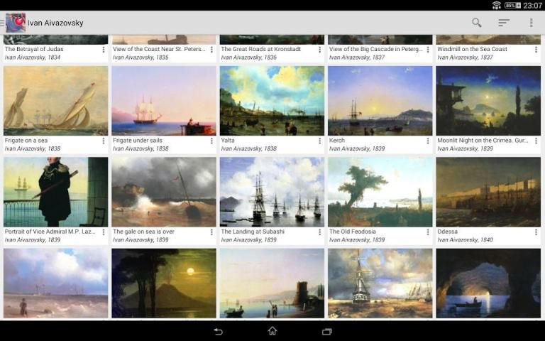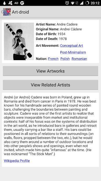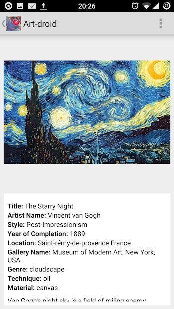 Seni-droid memberi Anda akses ke salah satu yang terbesar koleksi on-line seni rupa. Konten tersebut disediakan oleh Wikiart.org (sebelumnya Wikipaintings.org)