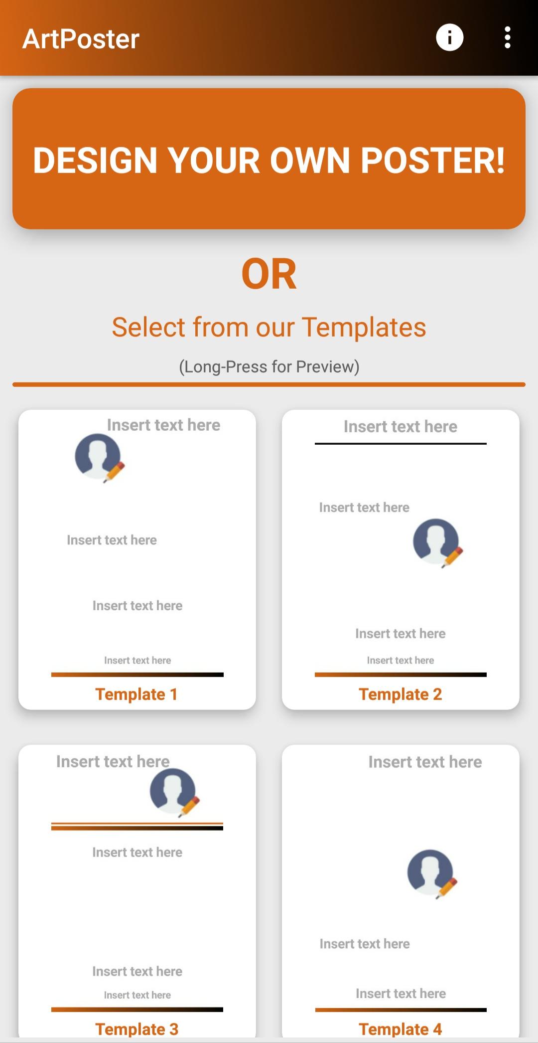 Art Poster allows you to make your own posters by selecting any one of our new templates.Choose from multiple templates according to type of poster you want to make.You can even share it directly on various platforms such as WhatsApp, Facebook, E-mail, etc.