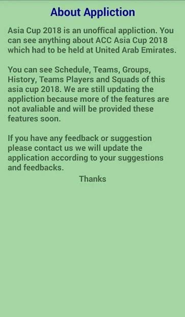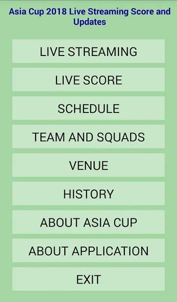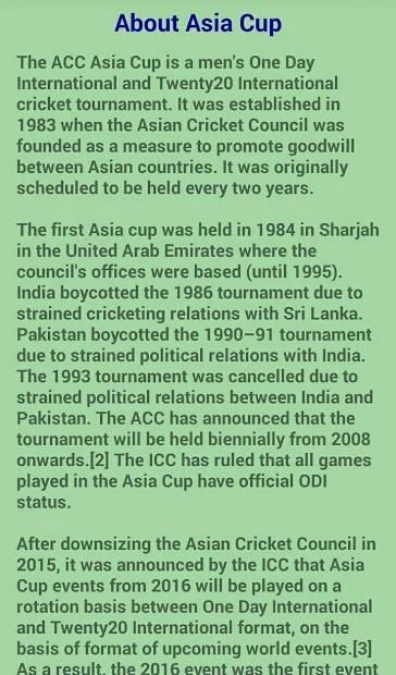 Aplikasi ini adalah tentang asia cup cricket 2018 yang diadakan di Uni Emirat Arab pada bulan September 2018. Aplikasi ini termasuk jadwal, tim skuad, skor langsung, live streaming, sejarah piala asia dan banyak lagi. Total 6 tim akan mengambil bagian dalam Turnamen ini. Final akan dimulai pada 28 September 2018. Aplikasi ini juga termasuk daftar nama pemain tim, tempat turnamen itu, pembaruan skor langsung, live streaming dll.