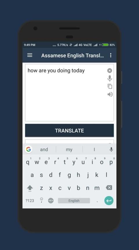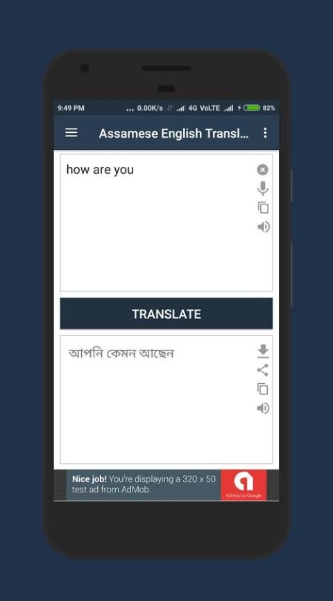 Assam English Translator difasilitasi dengan Sejarah Terjemahan dan daftar favorit. Anda dapat merekam suara Anda dan penerjemah itu sendiri dapat berbicara pekerjaan dan kalimat dalam kedua bahasa Assam dan Inggris. Anda dapat berbagi Terjemahan dengan teman-teman Anda dan juga dapat menyalin teks yang diterjemahkan ke mana saja Anda ingin menggunakannya. Ini adalah aplikasi Translator terbaik yang dapat menerjemahkan antara bahasa Assam dan Inggris.