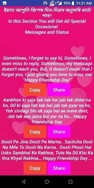 Event-based status: Apps Provide event base status for a special event Like Teachers Day wish, Independence day Status, Republic day Status, Diwali status, Diwali Shayari, valentine day status, valentine day Shayari, friendship status, friendship day status, new Year Status, Happy new Year Status, Navratri Status, Mothers day status, fathers day status, and much more available in Assamese, English, Hindi and Bengali language.
