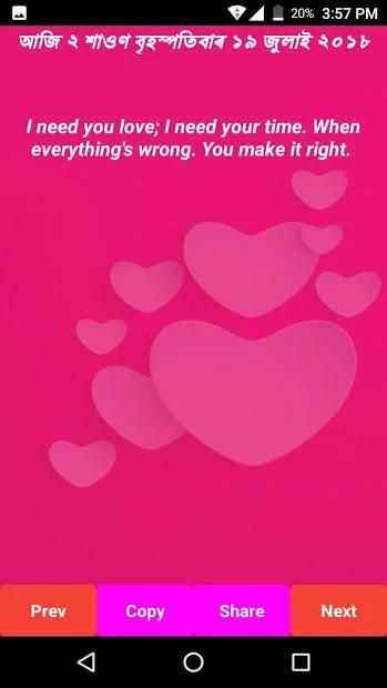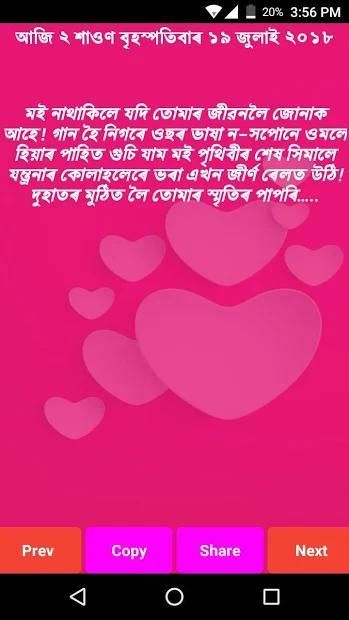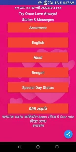 Status Assamese 2018, status dan kutipan Assam, Pesan Romantis SMS Cinta Sedih, Quotes Sikap, Status hilang, dll juga tersedia Empat bahasa Assam, Inggris, Hindi dan Bengali juga.
