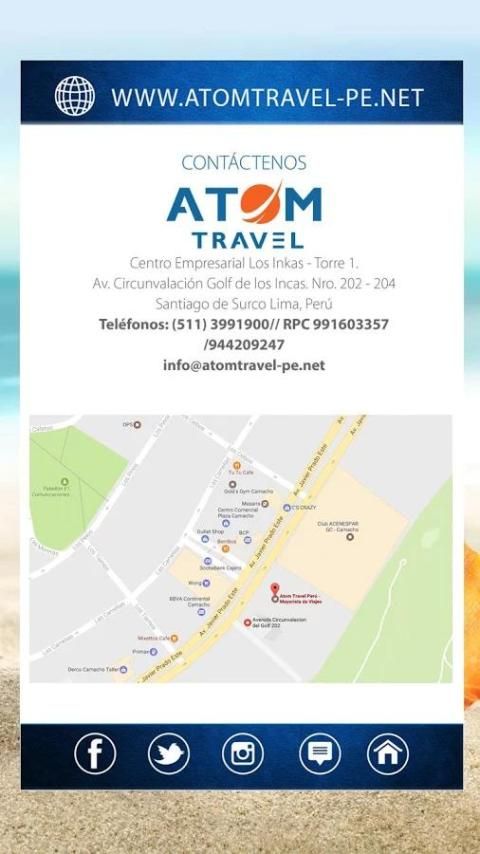 ATOM Tavel, grosir pariwisata dengan beberapa tahun di insustria pariwisata Peru menawarkan semua pariwisata kita ke lima benua, menawarkan panduan musiman dunia, paket dan wisata, olahraga dan acara, berita, sewa mobil , kapal pesiar, hotel dan penerbangan.