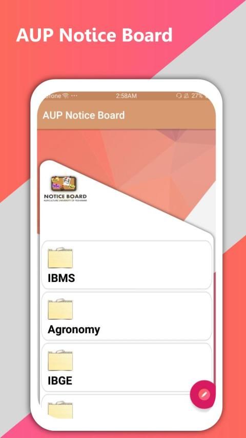 In this app the users can easily download the notifications provided by the university officials . Students will no longer go to notice board, administration again and again to annoy them . Generally this application is for the students of AUP under the title "Aup Notice Board" . The purpose of this application is to provide quick information about the results and different kinds of notifications.