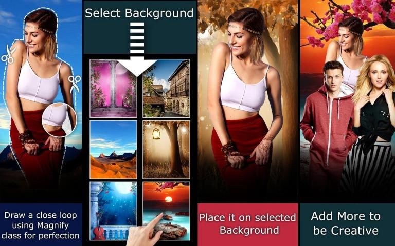 Dengan Backgrounds Erase Foto, latar belakang New dengan Bantuan alat Eraser Magical untuk latar belakang. Background Eraser adalah yang paling canggih alat Photo Editing untuk menghapus latar belakang foto dan Mengubah latar belakang pic Anda. App menyediakan banyak latar belakang HD dengan Landscape dan Portrait Mode.