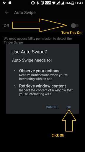 • Install the app Auto Swipe , allow required permission ,Enable auto left or right swipe. open TiinderrApp app ,