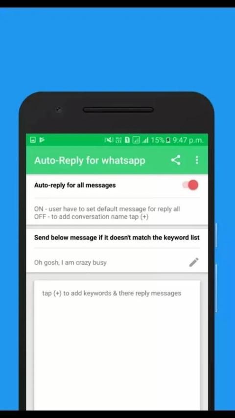 Auto-Reply untuk WhatsApp memberdayakan Anda untuk menjawab pesan WhatsApp otomatis, auto jawaban untuk WhatsApp akan memberdayakan Anda mengatur pesan khusus untuk membalas pesan WhatsApp Anda.
