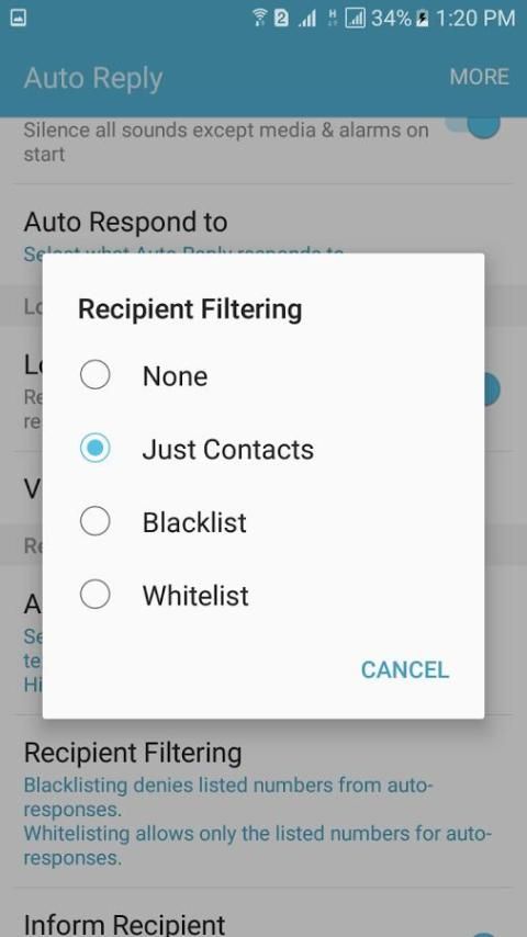 6. Penerima Filtering: Anda dapat menyaring respon auto dan dapat mengatur daftar hitam, daftar putih atau dapat mengatur hanya kontak saja.