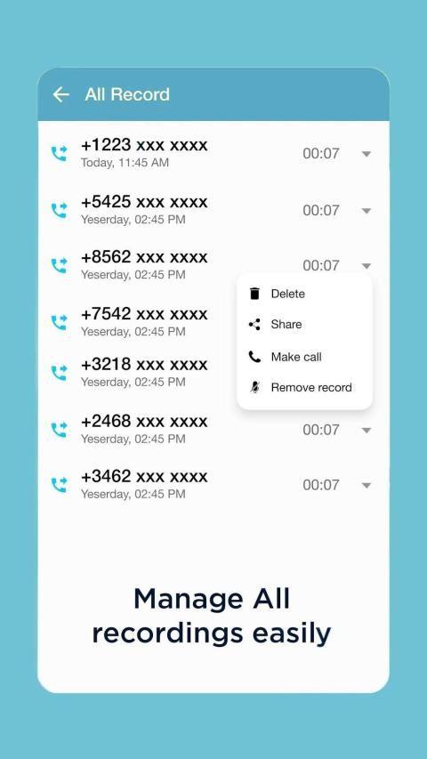 Aplikasi ini berfungsi sebagai perekam panggilan telepon otomatis dan perekam suara. Sekarang Anda dapat merekam panggilan telepon dari kedua sisi secara gratis, merekam percakapan telepon selama panggilan, merekam panggilan secara otomatis, mengelola dan berbagi file rekaman Anda dengan mudah.