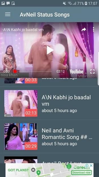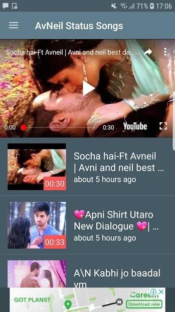 Avneil Serial Video Status Contains the tv serial video song ,title song ,romantic song etc.AVNeil VIdeo Status for WhatsApp app has unique video status for set the whatsApp video status.