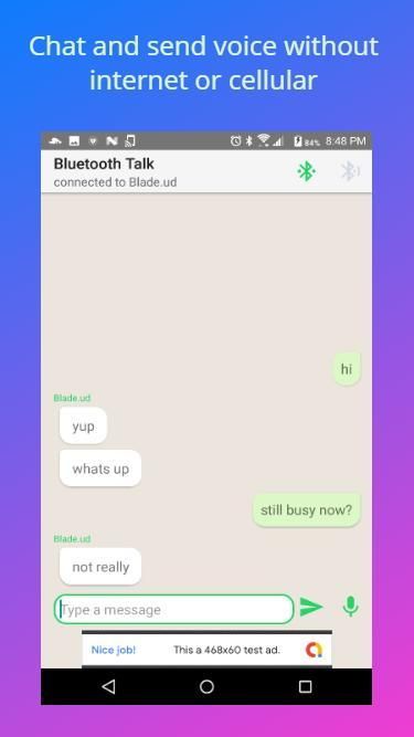 Bluetooth Talk is an application to send messages via Bluetooth, it can send text and voice.