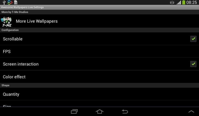 Anda dapat meningkatkan ukuran, kecepatan atau kepadatan elemen, serta memilih tiga efek warna yang berbeda dan tiga intensitas warna yang berbeda. Untuk menyesuaikannya, buka aplikasi, klik "Atur Live Wallpaper" dan kemudian klik "Pengaturan"