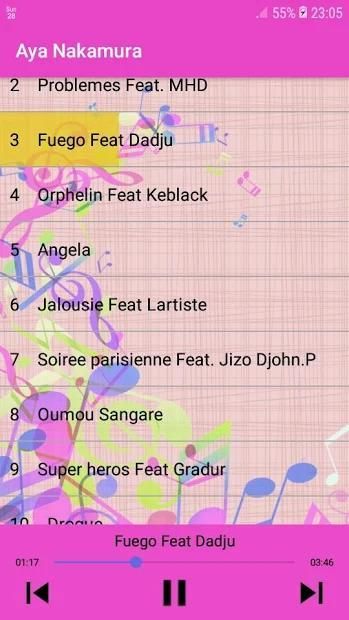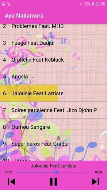 Aplikasi Cette présente les meilleures chansons d’Aya Nakamura. Ces chansons sont les mieux vue, les plus entendues et les plus classées dans les charts.