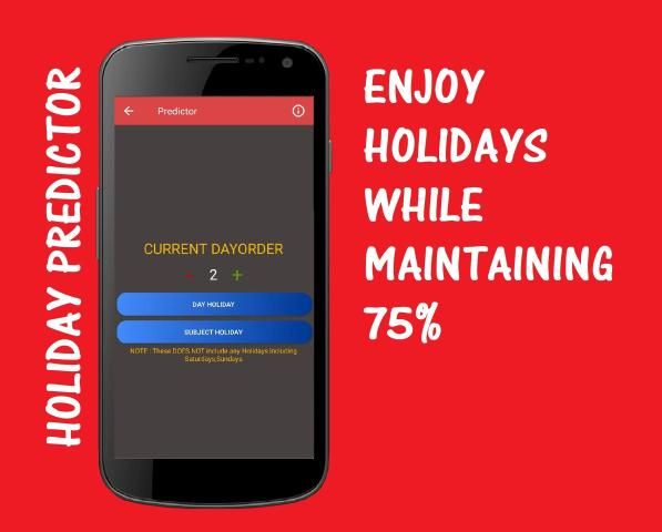 Are you tired of calculating after how many classes, you could afford to miss so that you could study for exams or participate in extracurricular activities, etc? Well here's your solution, this class holiday predictor gives out the number of classes you could miss in that subject for the upcoming 30 day-orders and meanwhile maintaining 75% in that subject.