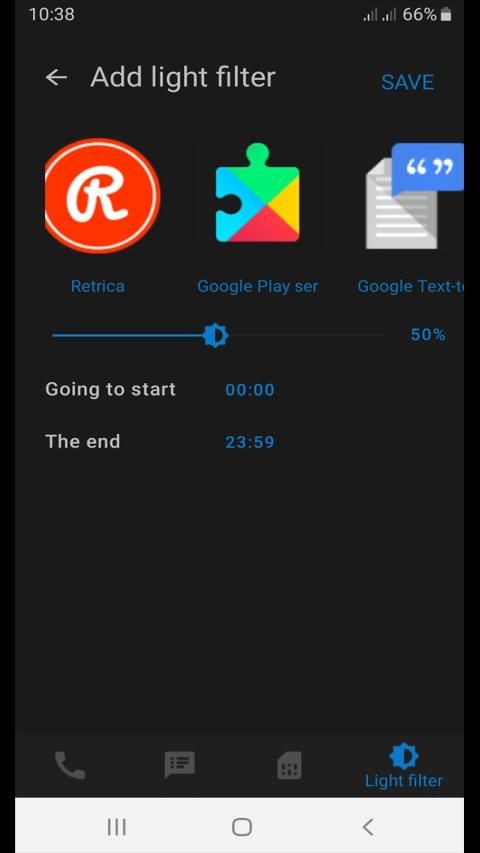 • Tambahkan aplikasi apa pun ke filter cahaya biru dan kemampuan untuk menentukan waktu kapan filter cahaya biru akan mulai dan berakhir dengan program yang dipilih (misalnya: filter cahaya biru dimulai ketika pengguna membuka youtube dan berakhir ketika pengguna menutup youtube ).