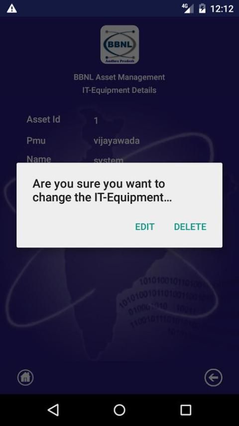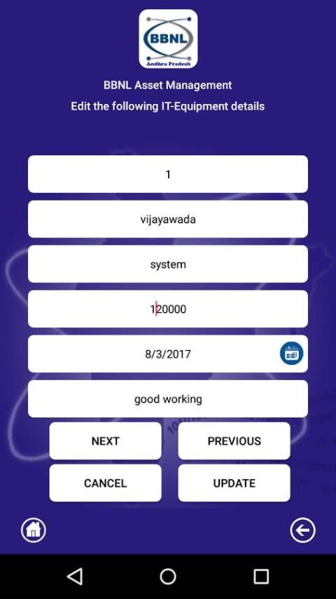 App ini adalah versi jejak dan saya meminta semua pengguna untuk menginstal aplikasi ke mereka Phones berbasis Android dan masukkan data dan menggunakan berbagai modul seperti IT Equipment, Furniture dan File .Anda diminta untuk mengirimkan saran berharga Anda ke e-mail gmbbnlvj@gmail.com. Berdasarkan saran Anda final BBNL Asset Management APP akan dicapai.