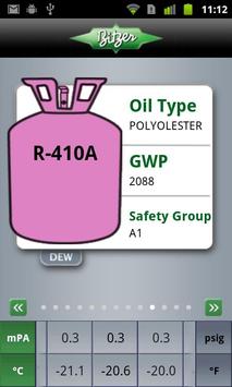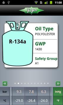 Each refrigerant is represented by a “dot” above the pressure wheel. Swipe left or right across the refrigerant bottle to switch to the refrigerant you desire. The color of the refrigerant bottle will match the official code for that refrigerant. The oil type, global warming potential, safety group, and corresponding pressure temperature wheel are also displayed. Swipe the temp –pressure wheel left or right to view the saturated pressure and temperature values.