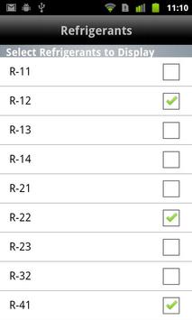 Touch the “Refrigerants” menu button to narrow down the list of refrigerants available.