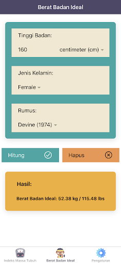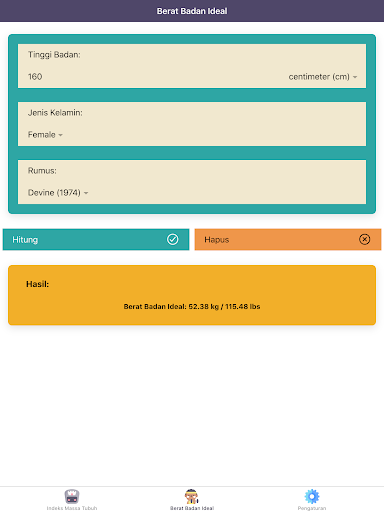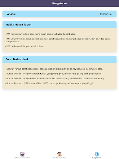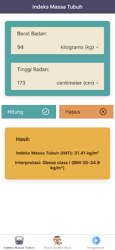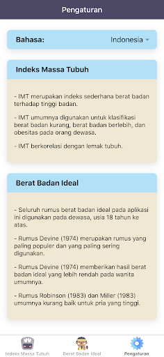 "Kalkulator IMT Pro: Indeks Masa Tubuh, Berat Ideal" juga akan menginterpretasikan hasil indeks massa tubuh (IMT) anda. Jika anda underweight, maka sistem imunitas tubuh dapat terganggu. Di sisi lain, overweight atau obesitas berhubungan erat dengan penyakit tidak menular, seperti hipertensi, diabetes mellitus, atau penyakit jantung koroner. Anda dapat menilai status berat badan anda dengan aplikasi "Kalkulator IMT Pro: Indeks Masa Tubuh, Berat Ideal" ini. Aplikasi ini juga dapat menentukan berat badan ideal (BBI). Perhitungan berat badan ideal (BBI) bergantung pada tinggi badan dan jenis kelamin anda. "Kalkulator IMT Pro: Indeks Masa Tubuh, Berat Ideal" memiliki lima rumus yang paling sering digunakan dalam menghitung berat badan ideal (BBI).