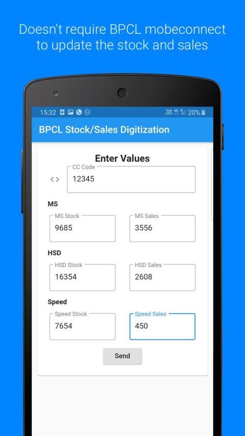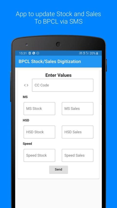This app can be used to update the Stock and Sales in your RO. This app can be used without the need for internet connection and mobeconnect since it uses SMS to send the details to BPCL. This app can be used by dealers who have low internet connectivity and have to update the BPC stock and sales via SMS.