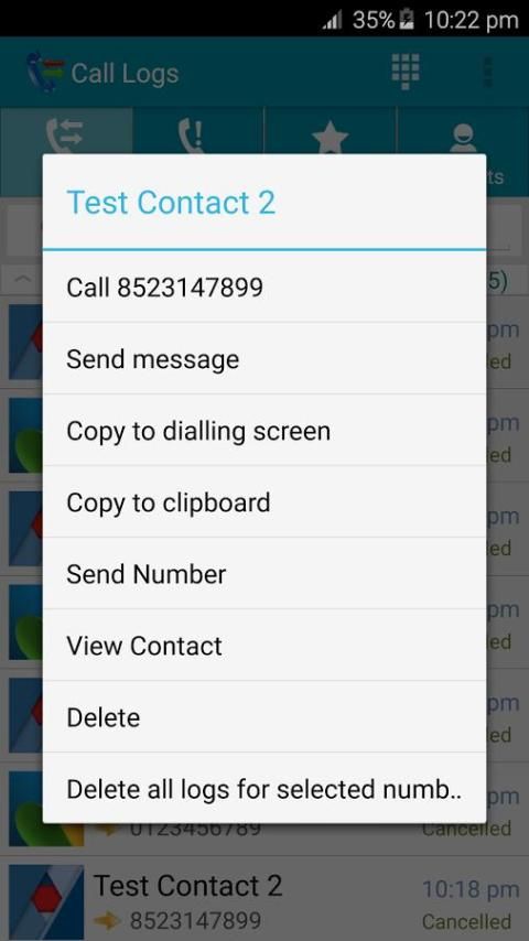 - Tekan lama entri dalam daftar untuk menelepon, mengirim SMS, copy ke layar panggilan, lihat kontak, menambahkan nomor telepon yang belum disimpan ke kontak yang ada atau membuat kontak baru, nomor telepon copy ke Clipboard, menghapus item log, mengirim informasi kontak menggunakan SMS . The menghapus semua log untuk pilihan nomor yang dipilih dapat menghapus semua log untuk nomor yang dipilih.