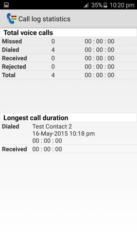 - Klik menjadi item log dari daftar untuk membuka rincian lihat. Anda dapat memanggil dan SMS nomor dari pandangan ini. Anda juga dapat melihat detail sejarah log dan statistik seperti jumlah terjawab, panggilan keluar, masuk, panggilan bersama dengan rincian tentang durasi untuk panggilan terpanjang keluar dan menerima dengan mengklik tombol Statistik ditolak.