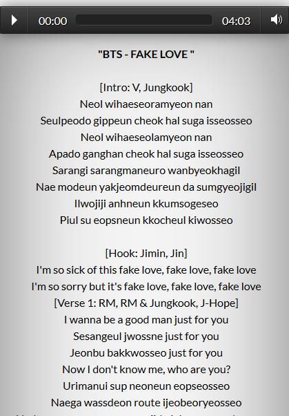 This is online mp3 songs lyrics collection by popular artist BTS. Listen online music from all album of the artist or band songs. This music streaming is over hundreds songs with lyrics popular by BTS and also the last album which is owned by the popular artist.