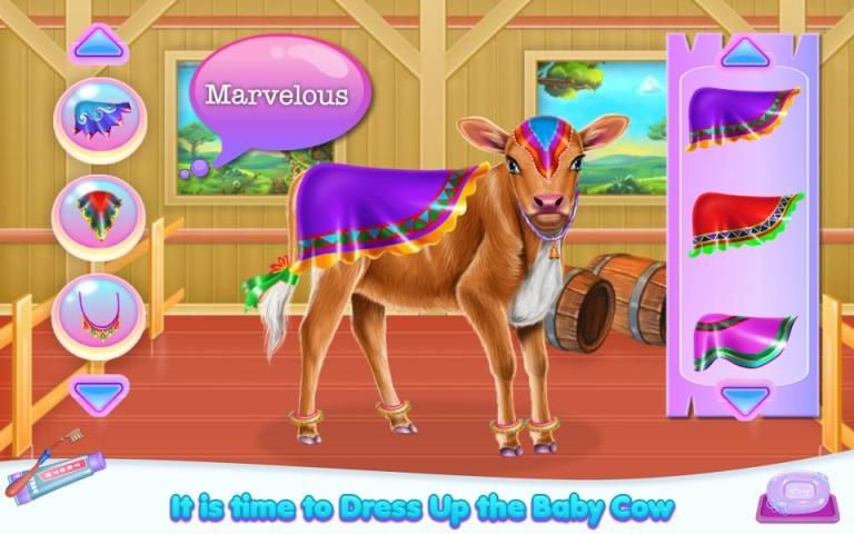 Welcome into the animal world and come to explore the diversity of a cow's caring taker. Clean, design and feed as for a real person. So this is how your job as a cow owner begin. As you've seen the fur is not looking amazing and you are about to clean it and make sure the little cow is happy with the new one. Start with the part where you wash her teeth and make sure they are stronger and ready for the eating part. Now you have to remove that layer of dirt that spread all over her skin, then make sure you apply some shampoo to clean the dust gather on it. Rub until the fur is going to have a brighter color and then wash the bubbles to see the results. Keep it up and try to go to the next step which includes the part where you prepare and offer food. Follow the instructions to give the right food in the suitable order. The cow is asking for it in a bubble image and what you spot you have to bring, so in this way, the baby will have his tummy fulfilled and will be for sure happy. Once the caring phase is over you will have to deal with the dressing up. Use your creativity and add pretty accessories to complete this cow look.
