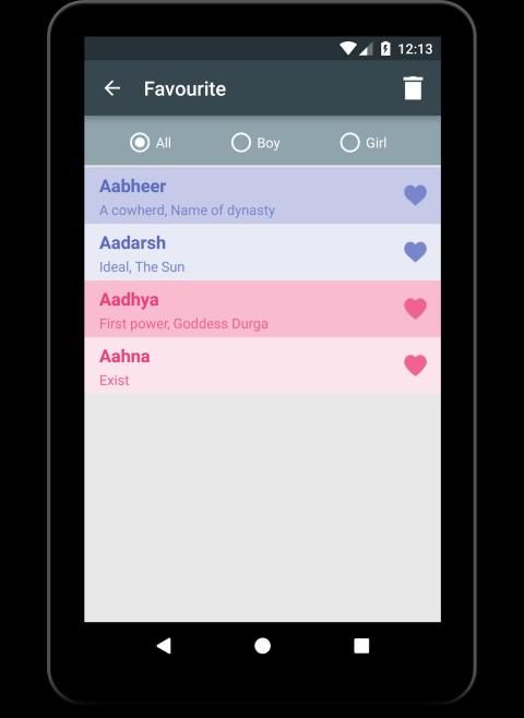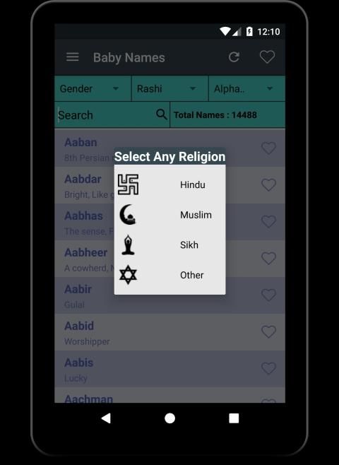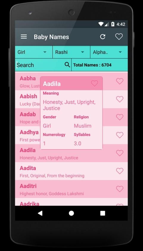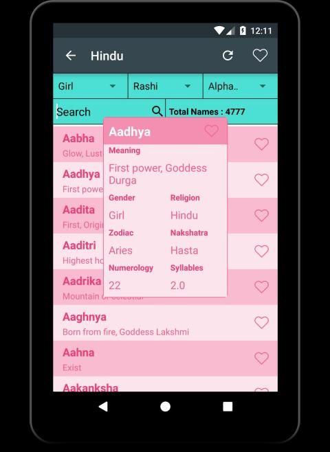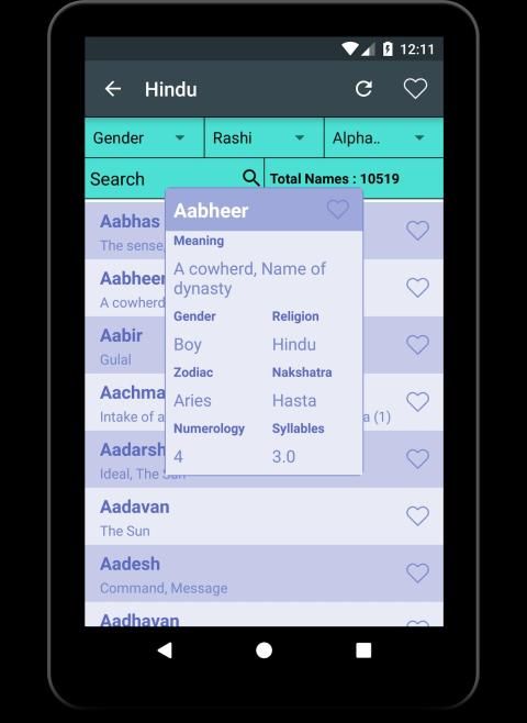 Baby name is an app that helps you find Name/Zodiac/Rashi letters for the newborn child in your family. The app has very simple UI, and it is very easy to use with a-z baby names list. The search box is provided to help you search for the name starting with a particular letter. You can also find names starting with your favorite letters. You can select from a baby boy name or a baby girl name to start searching. Name meaning with Syllable, Numerology, and Zodiac is shown here in an interactive way. Using this app, selecting a name for the child has never been so easy.