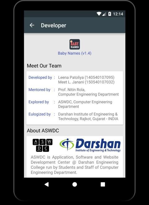 Aplikasi ini dikembangkan di ASWDC oleh Leena Patoliya (140540107095) dan Meet Janani (150540107032), Mahasiswa CE ke-7. ASWDC adalah Aplikasi, Perangkat Lunak, dan Pusat Pengembangan Situs Web @ Darshan Institut Teknik & Teknologi, Rajkot dijalankan oleh Mahasiswa & Staf Jurusan Teknik Komputer