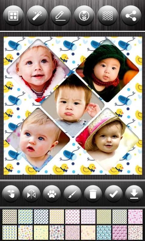 Baby Collage photo editor will help you to make photo grid making tool for adding unique collage effect. With this app you can enhance photos adjust color, add effects, rotate, crop, resize on your baby photos. The easy touch and zoom, rotate interface makes it simple to use with your photos.