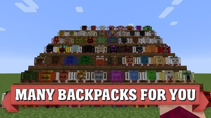 The Backpack mod yang bekerja menambah 34 ransel yang berbeda untuk mcpe ke permainan. Mereka berfungsi mirip dengan dada tetapi perbedaannya adalah bahwa Anda dapat menjaga mereka dengan mereka, dengan cara yang sama ransel minecraft akan bekerja. Currenly mereka tidak dpt dipakai tapi ini adalah fitur yang direncanakan yang akan ditambahkan segera di mod ini untuk minecraft. Ransel Minecraft mods benar-benar berguna untuk petualangan dalam mode bertahan hidup karena mereka memperluas jumlah slot inventory Anda akan dapat menggunakan.