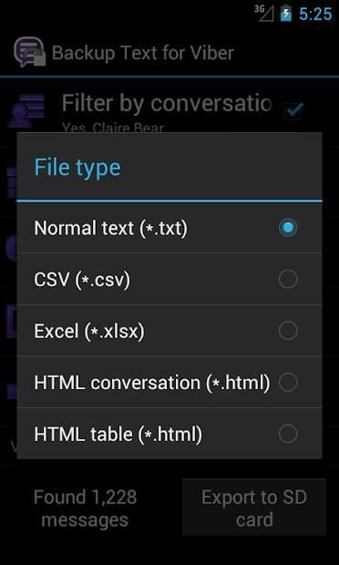 Backup Text for Viber allows you to export your Viber messages, convert to Plain Text, CSV, Excel and HTML file formats and yes, those files can be read in your phone or computer! Your exported files can be saved on your phone's SD card or sent to your email as attachment. It is fast and easy to backup your Viber messages!