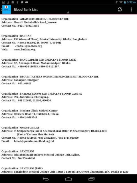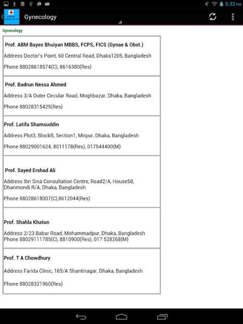 Aplikasi Android ini adalah aplikasi baru yang memberikan informasi kontak dari semua dokter terkenal di kota Dhaka dengan nomor telepon kamar mereka, mengunjungi waktu dan alamat. Anda juga akan mendapatkan daftar semua bank darah dan nomor telepon mereka di app Android ini.