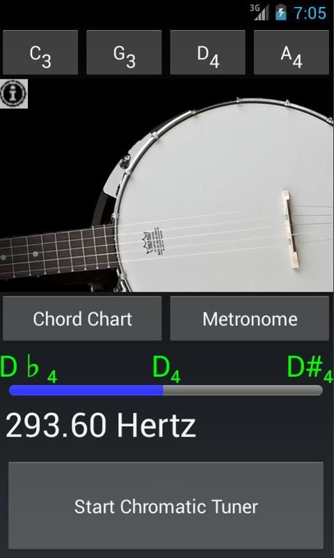 72 of the most popular chords are listed in the Tuner to help you find the correct chords to play while practicing your Banjo.