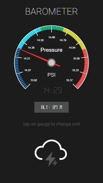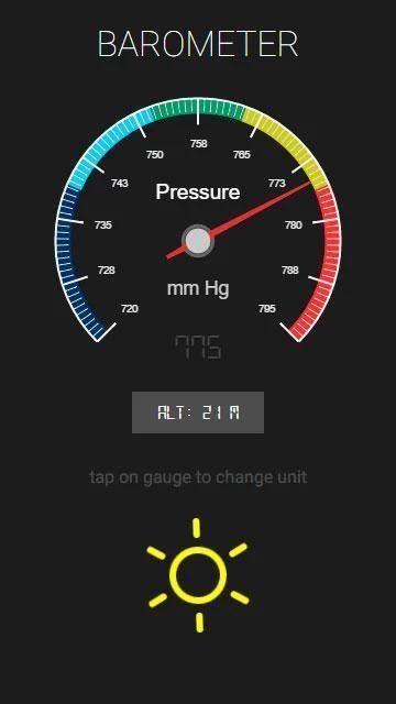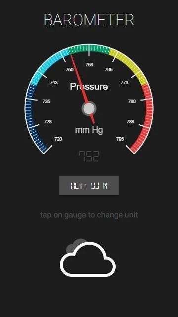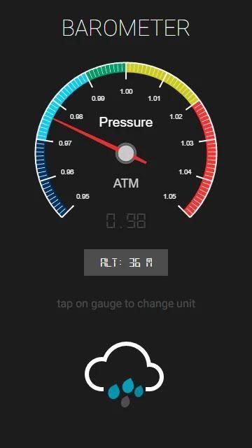 Barometer untuk menampilkan tekanan atmosfer dan cuaca mungkin dalam bentuk ikon animasi. Tekanan ditampilkan di setiap unit: mm Hg, psi, atm, di, bar, mBar, hPa, Torr, Nm2, mm H2O. Juga displaed ketinggian (dalam meter) untuk posisi saat ini.