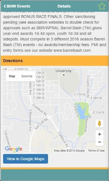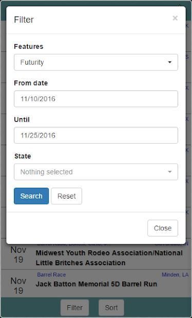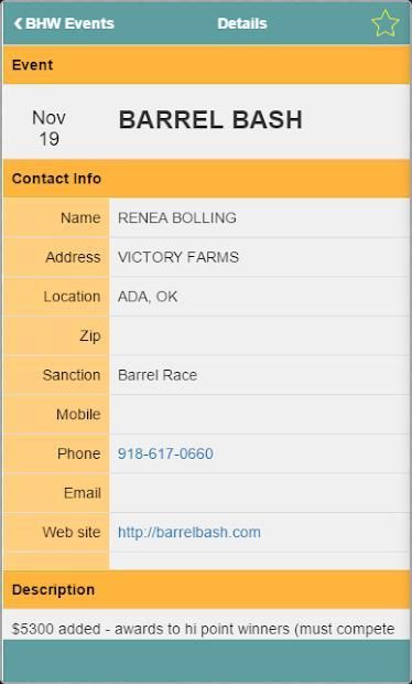 Find upcoming events for barrel horse races, rodeos and clinics. Each event includes description and contact information. Filter by date, sanction, and state to find events in your area. Save your favorites to easily find them again