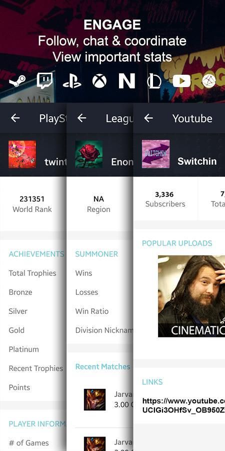 -Engage dengan gamer lain. Ikuti profil, chatting & koordinasi di Pesan. Tarik statistik penting pada profil terhubung mereka (Twitch, Steam, YouTube, PlayStation Network, Xbox Live, Nintendo dan League of Legends)