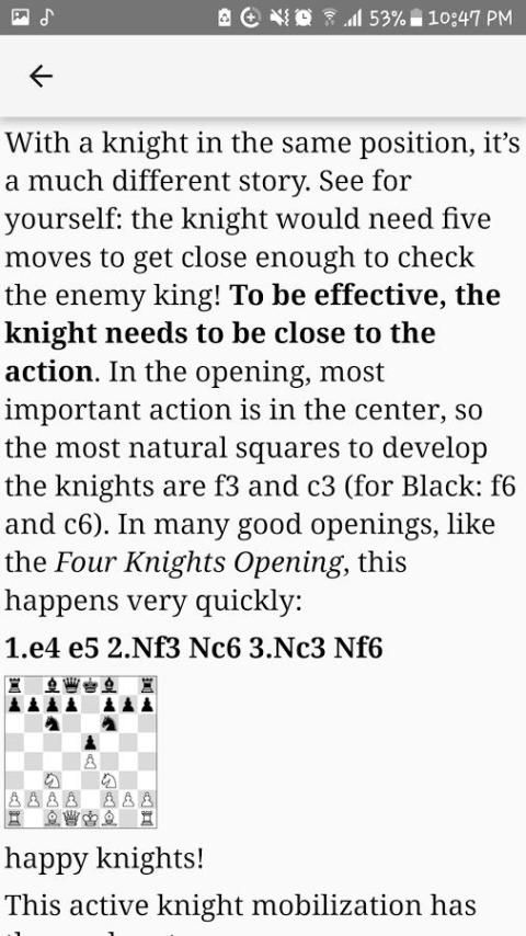 Kedengarannya mudah, bukan? Tapi siapa pun yang telah memainkan beberapa game tahu bahwa ide-ide catur yang baik adalah lebih rumit daripada mereka tampaknya. Hal ini membutuhkan latihan dan belajar untuk belajar bagaimana untuk secara konsisten mendapatkan potongan-potongan Anda ke dalam tindakan dengan cepat dan efektif. Ada tiga hal untuk menguasai: apa artinya tepatnya untuk mendapatkan potongan-potongan ke dalam tindakan dan bagaimana melakukannya dengan cepat, dan apa yang membuat bergerak efektif. ‘Efektif’ adalah kata besar yang berarti ‘mampu melakukan hal-hal’. Seringkali anak-anak bergerak sepotong cepat, tetapi untuk persegi yang sangat tidak efektif.