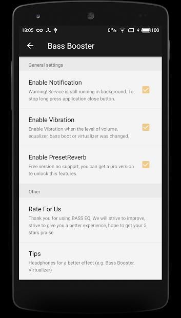 Bass Booster memungkinkan Anda menyesuaikan tingkat efek suara sehingga Anda mendapatkan yang terbaik dari Musik atau Audio yang keluar dari ponsel Anda.