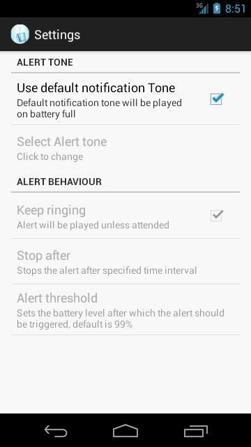 Dalam versi Pro:-Pemberitahuan Nada, Level baterai Threshold (Level setelah itu Anda ingin alert) dan menetapkan Interval Waktu setelah peringatan harus tutup mulut, sehingga tidak berubah menjengkelkan.