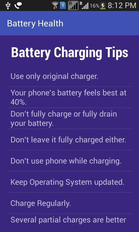 Baterai Kesehatan adalah aplikasi yang sangat sederhana dan User-friendly yang memungkinkan Anda tahu kesehatan baterai perangkat Anda. App tidak memerlukan izin khusus dari perangkat Anda. Mendukung semua perangkat dari mulai dari API 14 ke API 25. dirancang khusus untuk perangkat Low-End. yang aplikasi dasar yang dapat digunakan untuk memeriksa kesehatan baterai ponsel Anda.