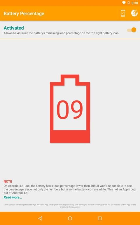 - On Android 4.4, until the battery has a load percentage lower than 40%, it won't be possible to see the percentage, since not only the numbers but also the battery icon are white. This not an App's bug, but of Android 4.4.