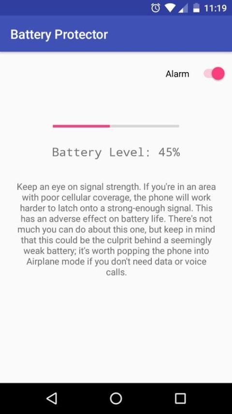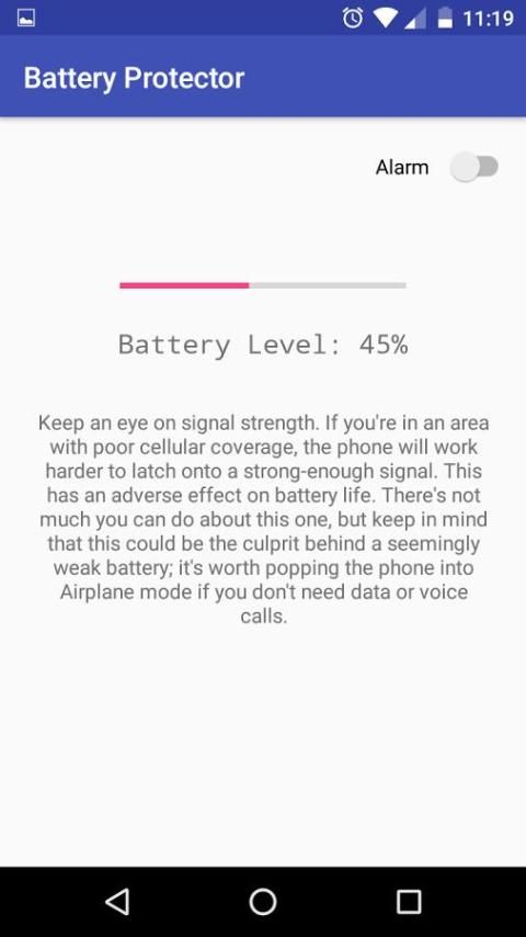 alarm baterai penuh adalah sebuah aplikasi unik yang memberitahu pengguna ponsel saat baterai ponsel mereka adalah bermuatan penuh atau terlalu rendah.