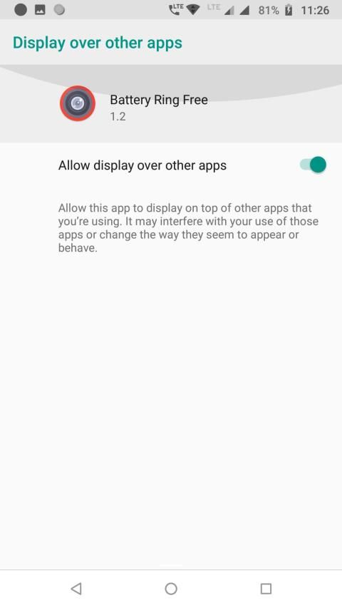 Cincin Baterai memerlukan izin sistem overlay untuk menggambar cincin energi di layar. Aplikasi tidak memiliki fitur apa pun yang memerlukan akses aplikasi yang berjalan, seperti menyembunyikan cincin energi ketika aplikasi berada pada layar penuh, dan ini juga membantu membatasi layanan Cincin Baterai hingga beban 0% pada CPU.