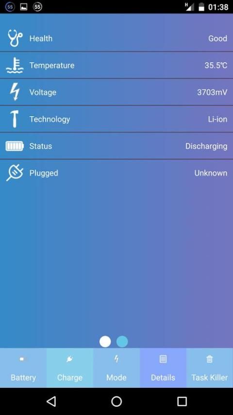 Battery Saver - Battery Doctor menunjukkan informasi tentang pengisian cepat, rincian baterai tegangan dan suhu.