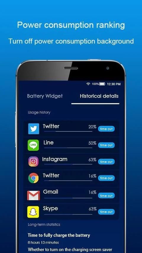 The power consumption of apps installed on your devices based on power consumption from high to low ranking, you can turn off the high power-draining apps to extend battery life!