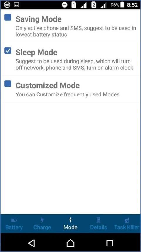 Memilih mode baterai yang berbeda: modus baterai rendah, keamanan, modus tidur dan mode populer lainnya.