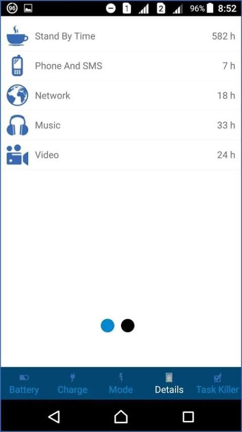 + Mode hemat baterai (menggunakan status baterai di tingkat terendah): Mengatur kecerahan hanya 10% dan Wi-Fi diaktifkan perangkat dan standby 15 detik, 30 detik.